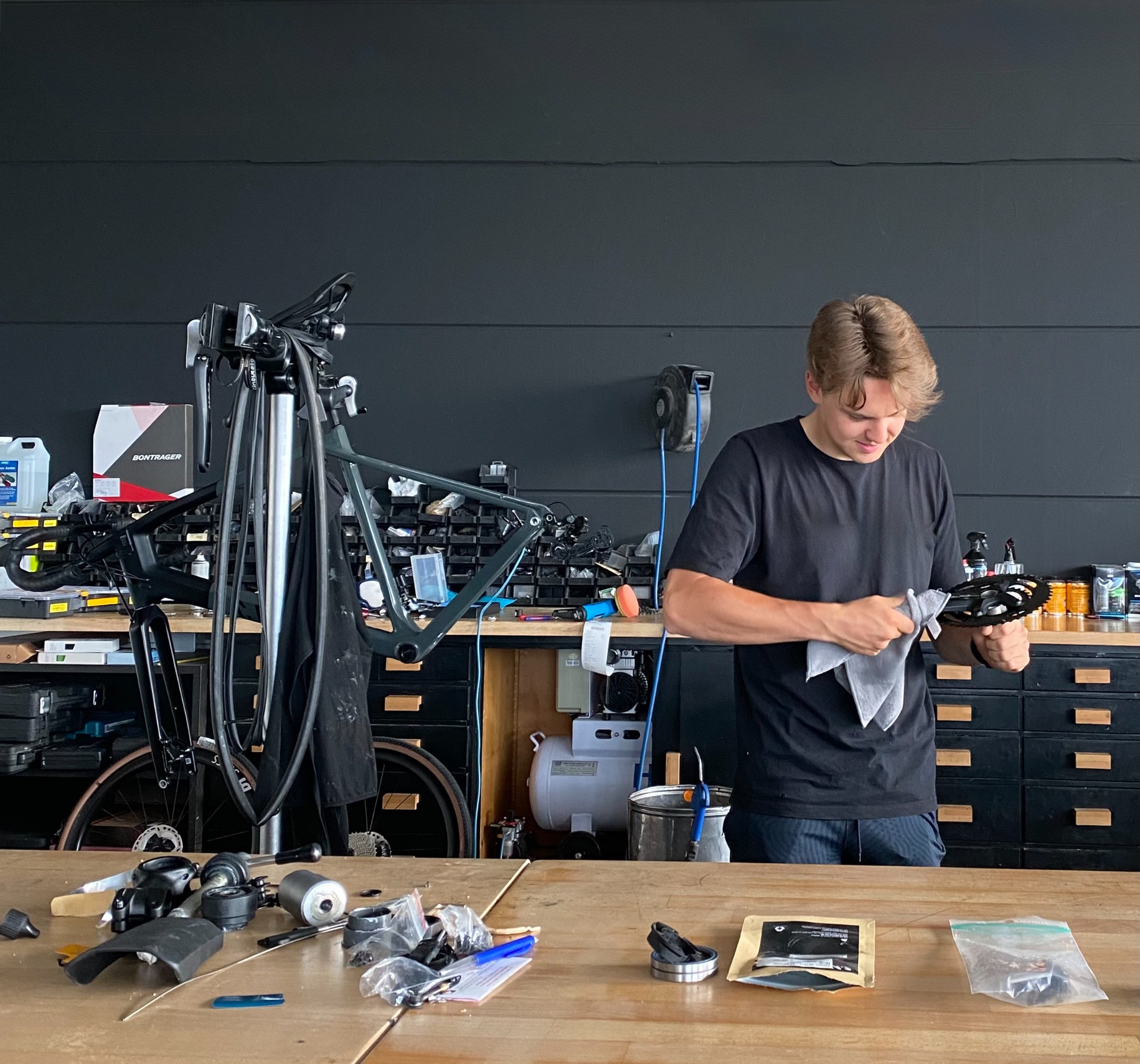 Na mijn periode in het veld stapte ik over naar het wegwielrennen, sindsdien ben ik altijd blijven sleutelen aan mijn eigen fietsen. De afgelopen vier jaar kon ik mijn kennis nog verder uitbreiden in een high-end fietsenwinkel, waar ik dagelijks werkte met topmateriaal en de nieuwste technologieën.